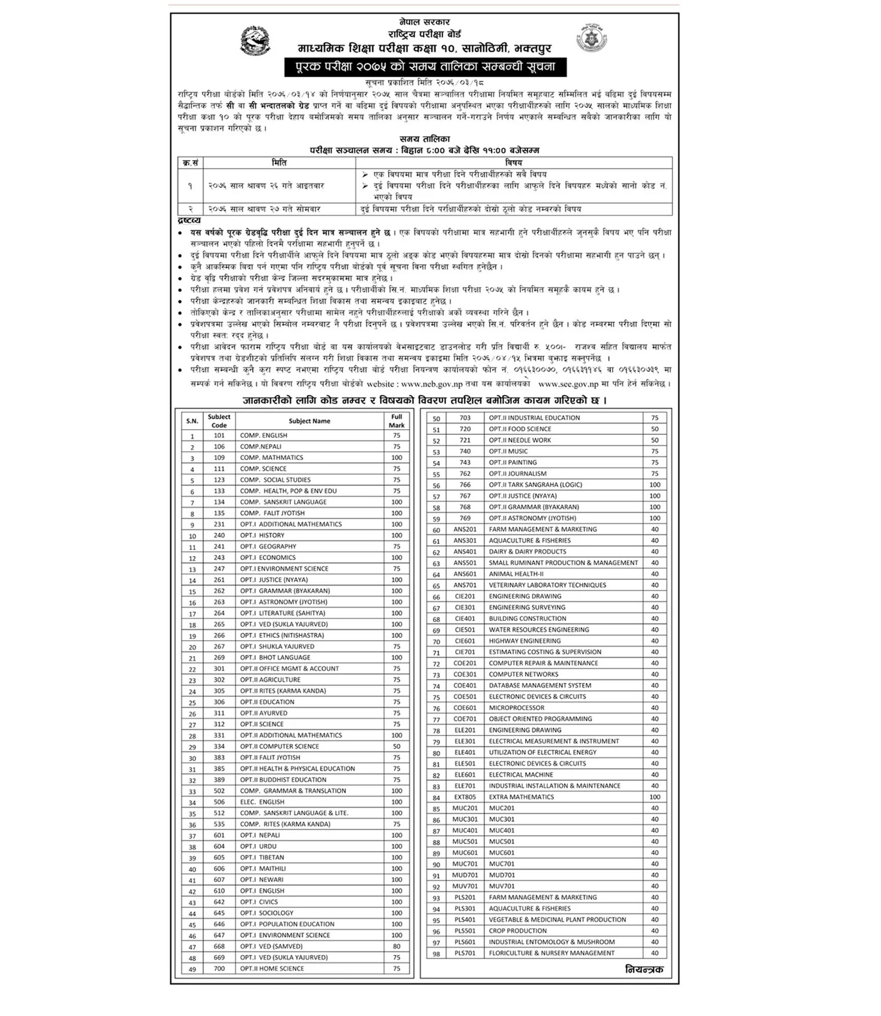 काठमाडौँ, राष्ट्रिय परीक्षा बोर्डले माध्यमिक शिक्षा परीक्षा (एसइई) को पूरक परीक्षाको परिक्षा तालिका यहि श्रावण २६ र २७ गतेको लागी तोकेको छ ।