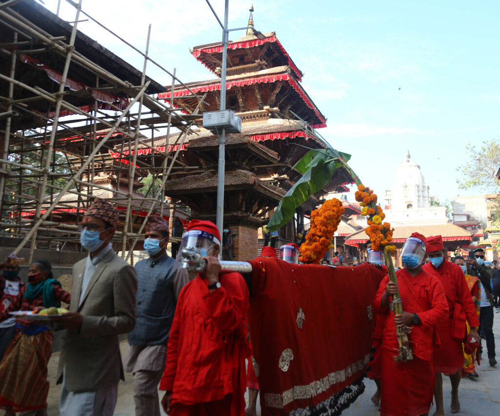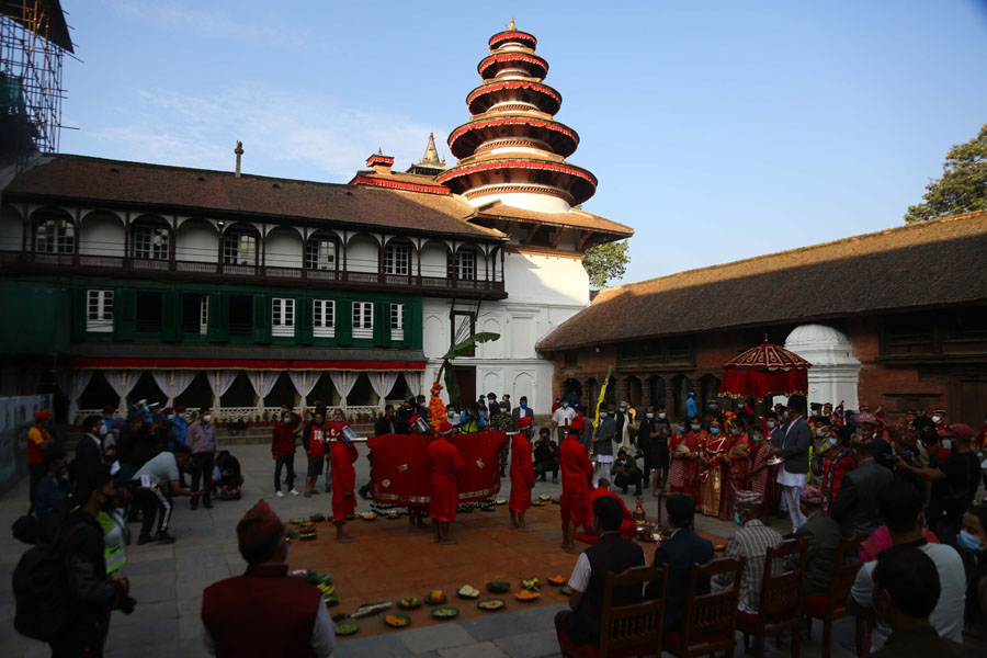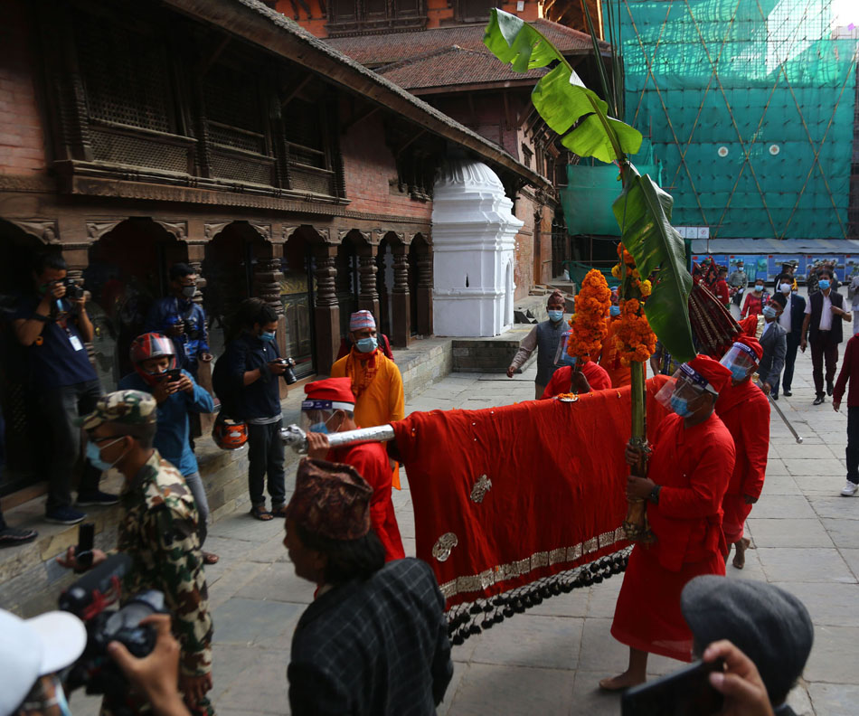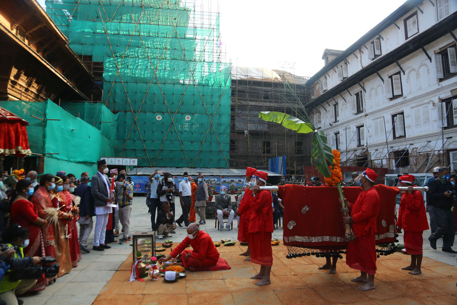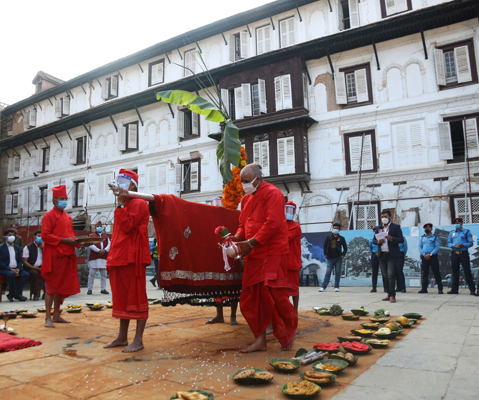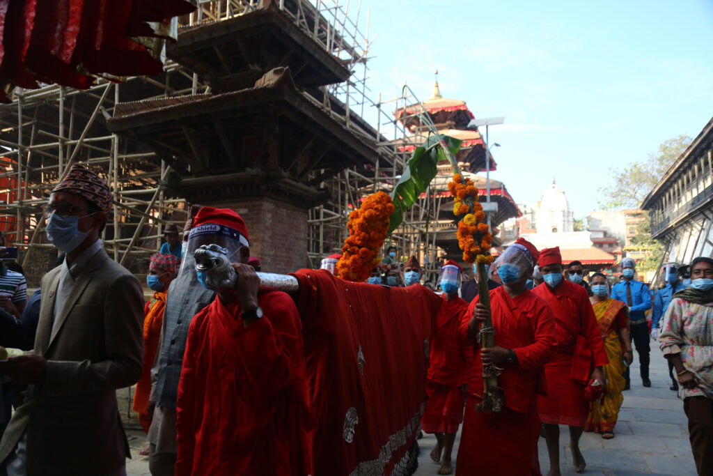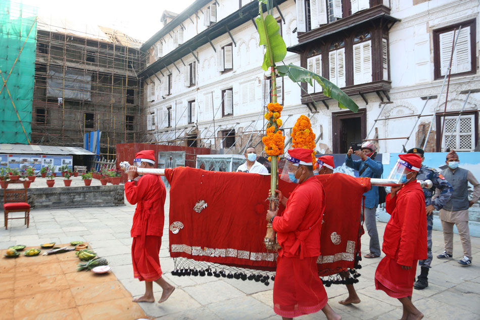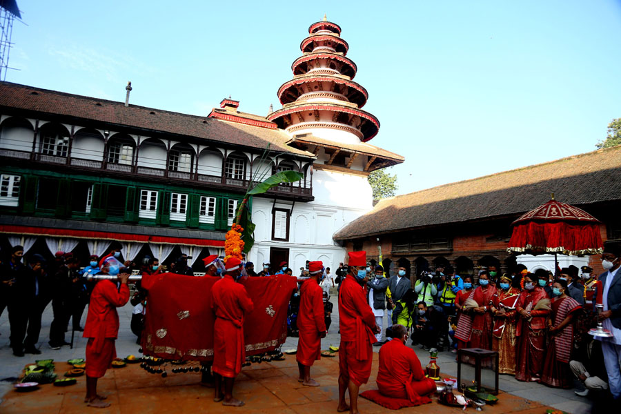 काठमाडौँको बसन्तपुर दरबारस्थित हनुमानढोकामा रहेको दशैं घरमा शुक्रबार फूलपाती भित्र्याउँदै । हनुमानढोका दरबारको दशैघंरमा गोरखा जिल्लाबाट ल्याइएको फूलपाती भित्र्याउने परम्परा रहेको छ ।
